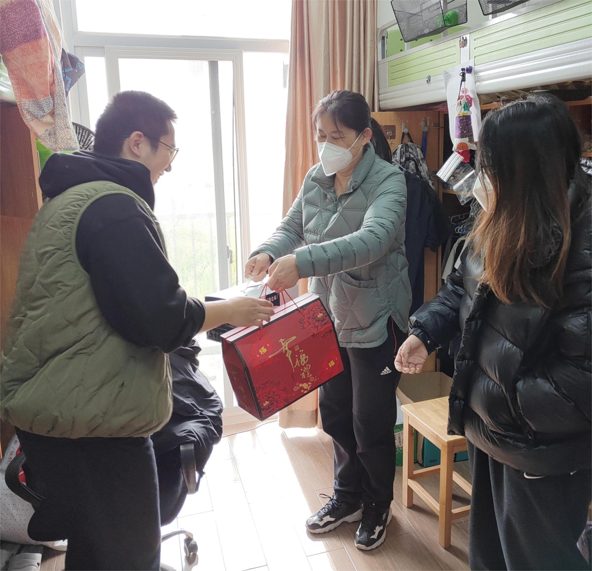 2023年1月9日,色情网 色情网 党委书记童莹娟、党委副书记胡秋丽、辅导员王鑫、陈英英一行人走访甬研公寓、南门公寓,看望慰问寒假留校学生,为其送上新春祝福,并且发放含牛奶、坚果在内的“新春”礼包。
