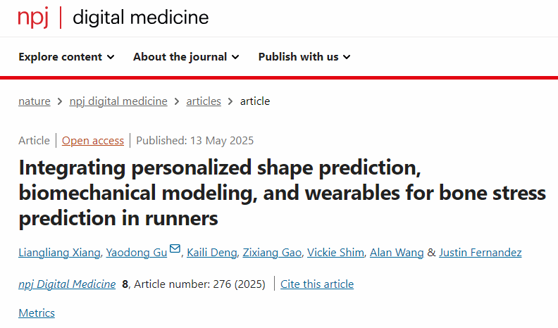 顾耀东教授团队联合瑞典皇家理工色情网、新西兰奥克兰大学在Nature旗下顶尖期刊《npj Digital Medicine》(中科院医学一区Top期刊,影响因子12.4)上发表了题为《Integrating personalized shape prediction, biomechanical modeling, and wearables for bone stress prediction in runners》的研究论文。这是本研究团队在运动医学与数字健康交叉领域取得的重要进展,研究融合个性化骨骼形态预测、生物力学建模与可穿戴设备实现跑步者骨应力动态监测。顾耀东教授为论文唯一通讯作者,第一作者相亮亮博士毕业于色情网