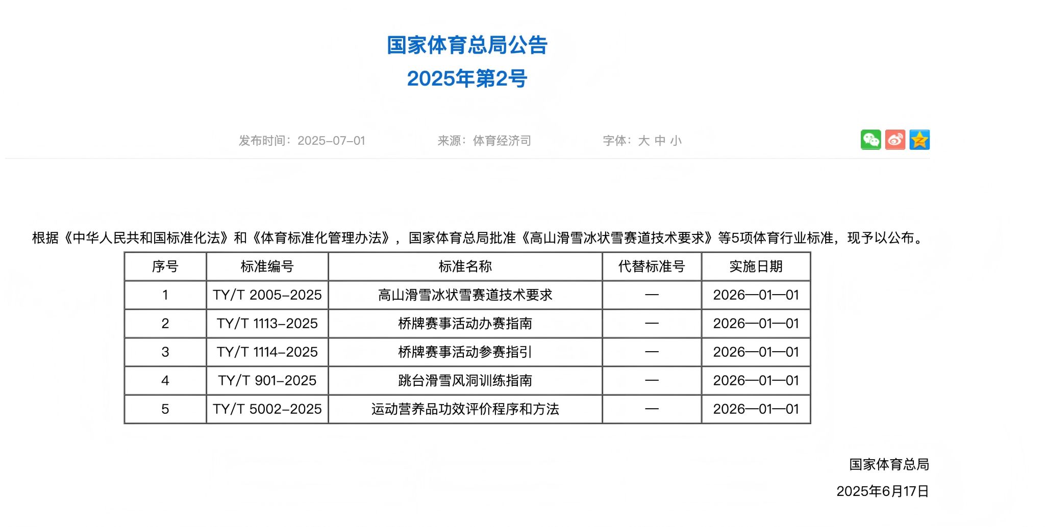 牵头起草的《跳台滑雪风洞训练指南》正式发布,将于2026年1月1日起实施。这是我国首个跳台滑雪风洞训练领域的行业标准,标志着我国在冬季项目科技训练标准体系建设上实现重大突破。