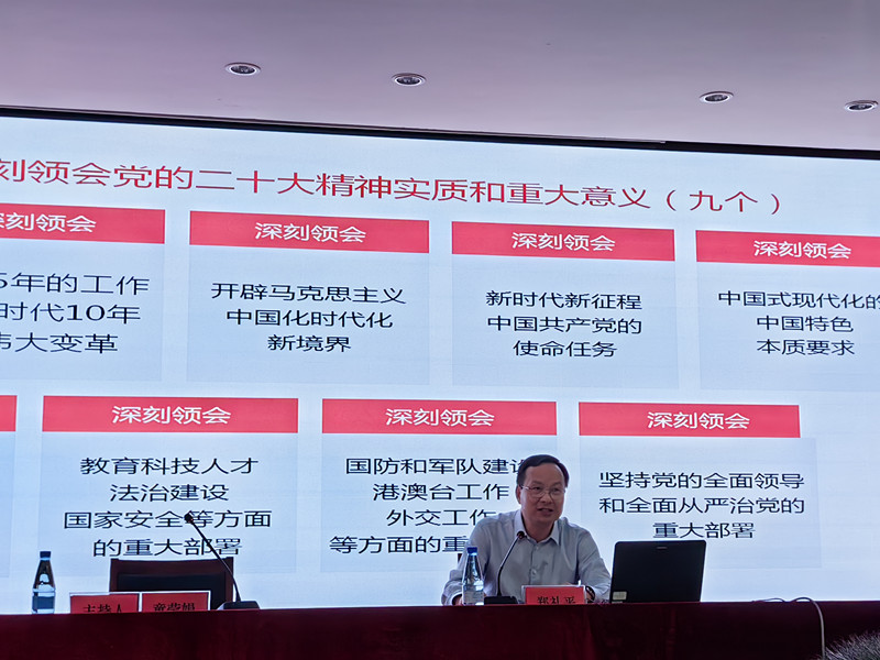 举行学习贯彻习近平新时代中国特色社会主义思想主题教育专题党课暨党委理论中心组学习(扩大)会。我校马克思主义学院郑礼平研究员应邀做“学习贯彻党的二十大精神 加快推进教育现代化”的主题宣讲。学院全体师生党员(含预备党员)、培养对象、入党积极分子等参加了学习。会议由院党委书记童莹娟主持。
