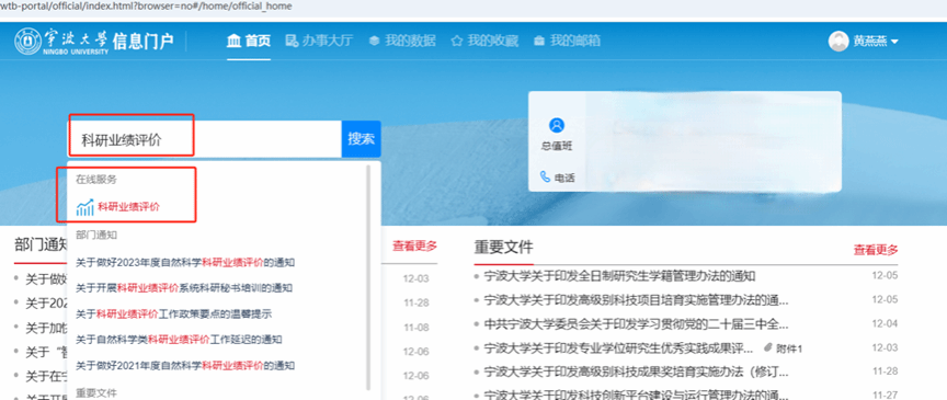 按照《宁大政[2021]93号文件》文件精神,学校开发完成科研业绩评价系统。在职教师信息门户登录后,搜索“科研业绩评价”点击就可以进入本系统,如下图: