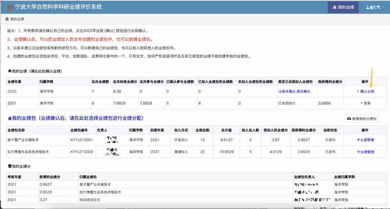 教师登录系统后首先需要对自己的业绩进行确认。在我的业绩中,点击“确认业绩”。
