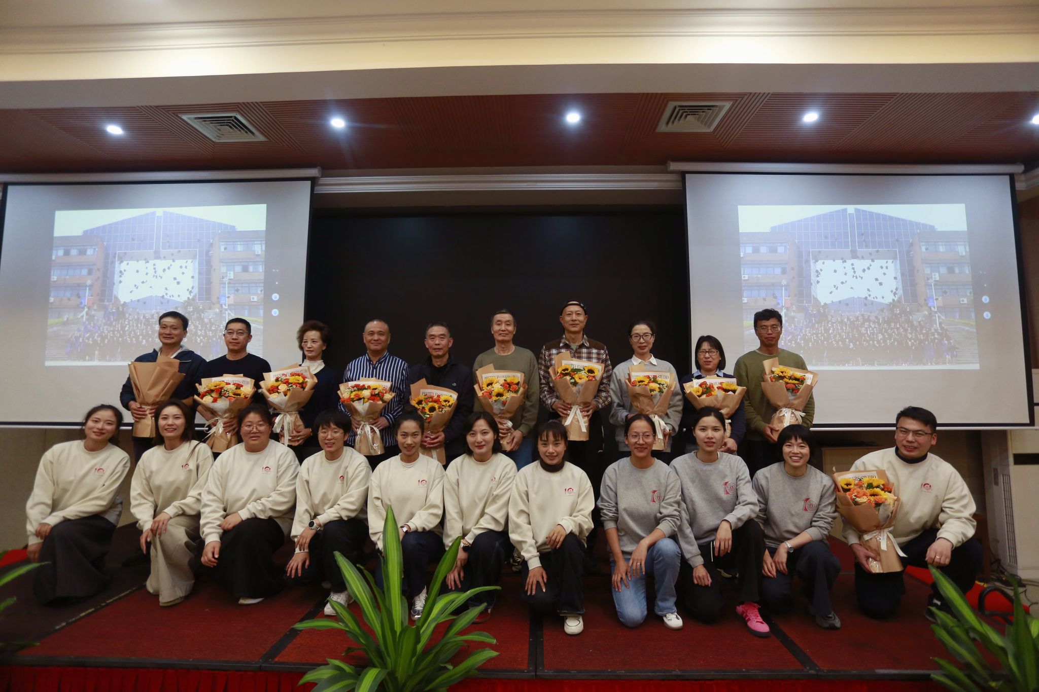 傍晚时分,“拾年·家宴”将活动推向又一个高潮。时任班主任裘琴儿、陈飞飞、以及任课教师谷晨、黄国平、赵月香、周海雄、刘健、徐培兴、夏东明等老师步入会场,引来阵阵热烈掌声。校友代表为恩师献上鲜花与礼物,表达深植于心的感恩之情,温馨场面成为晚宴最动人的开端。