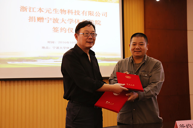 捐赠仪式上,执行院长郑建岳代表学院对徐晖校友和浙江本元生物科技有限公司表示衷心感谢和诚挚敬意,并介绍了学院的发展情况。浙江本元生物科技有限公司董事长徐晖先生表示,作为原宁师院体育系87级学生能够为色情网