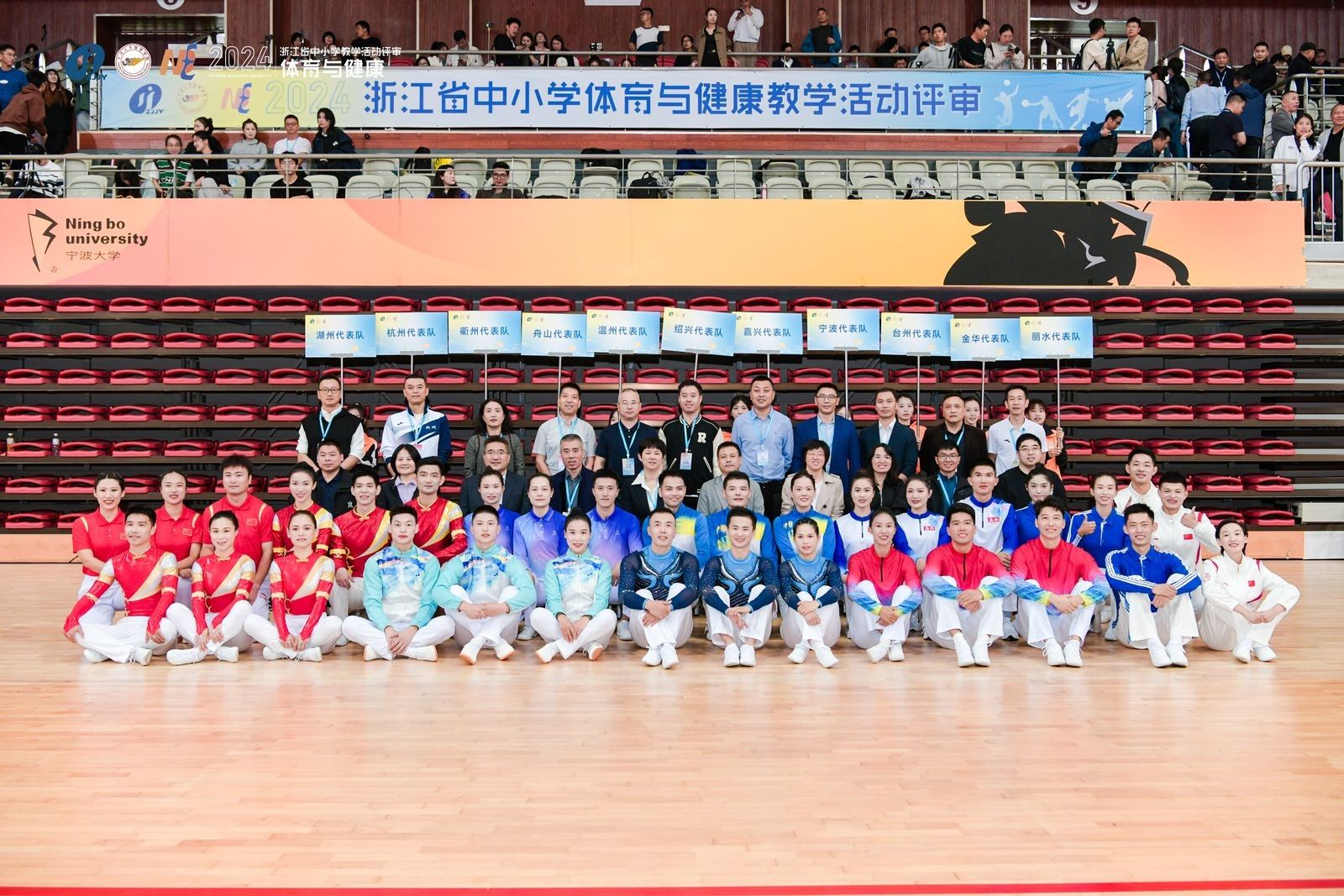 此次评审活动规模宏大,除了来自全省各地推选的 33 名中小学体育教师参赛外,还有由 33 位全省各地市教研员和正高级教师组成的专家团队进行评审。此外,全省各地派出了规模强大的观摩学习团队,共计 900 余人,其中包括我省中小学体育教学一线的教师以及不同高校的体育专业研究生和本科生。《中国学校体育》编辑部、北京教育学院、浙江师范大学和杭州师范大学等单位的专家代表也出席了本次活动。