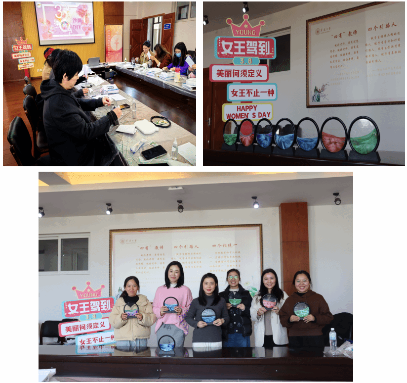 分工会为纪念三八国际妇女节,联合亚太物业在学院4楼会议室精心组织了一场流沙画DIY活动。流沙画是极具独特和艺术感的活动,不同颜色的沙粒带给作品不同的效果和氛围,蕴含了创作者的情感和浪漫表达。活动伊始,让每位女教师根据制作视频,选择自己喜欢的颜色进行创作。大家信心满满,纷纷动起手来,首先将沙粒倒入圆形的玻璃框内,待全部沙粒缓慢进入之后用胶水将封口封住,静置5-10分钟之后就可以装上外框,静静等待一天之后倒置的惊喜。流沙画DIY活动给女同胞们带来了欢乐,在欢声笑语中绽放自信与浪漫,不仅陶冶情操,也增进了同事之间的友谊,体会 诗情画意般的美好生活。体验流沙画,感受诗意与浪漫的方式庆祝“三八”妇女节,以此来丰富女教师们的文化生活,提升幸福感、获得感,展现巾帼风采。