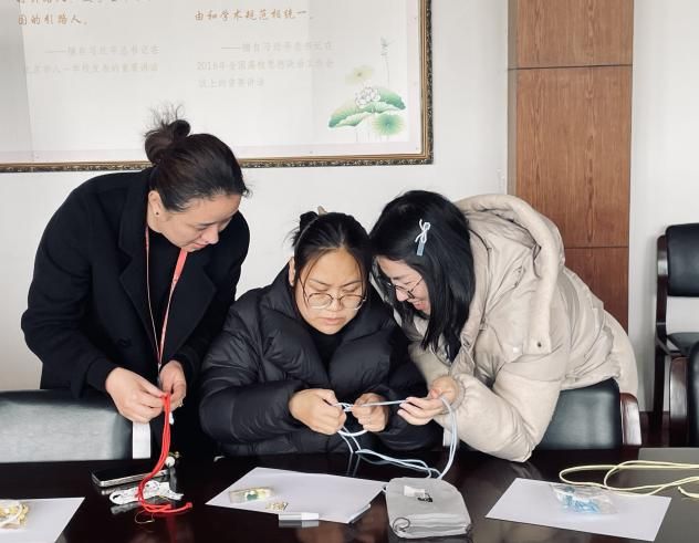 活动当天,分工会提前准备了丰富的材料包,并邀请专业手工老师现场指导。活动中,女教工们围坐一堂,认真聆听老师讲解编织技巧与设计要点,随后纷纷化身“巧手匠人”,挑选心仪的材料,穿针引线、打结编织,将平安祝福与艺术灵感融入指尖创作。